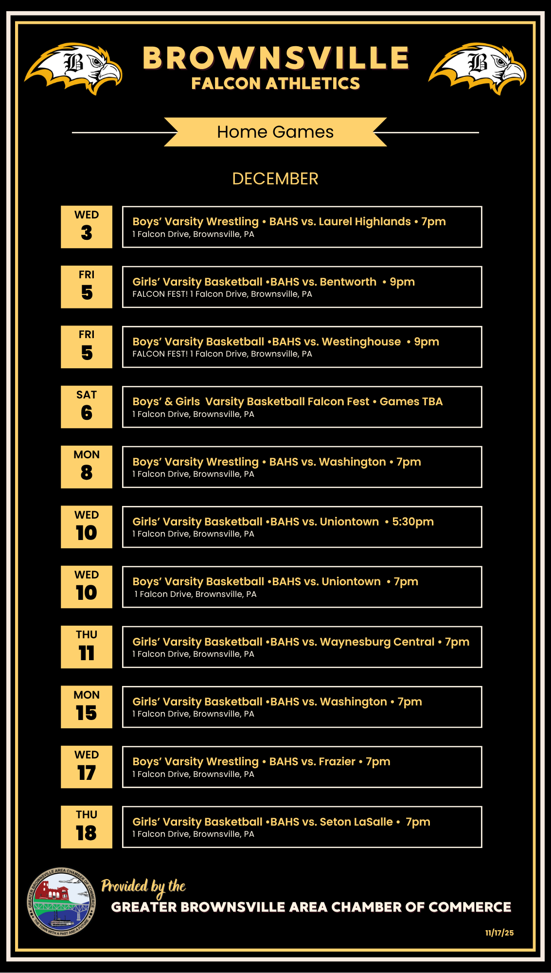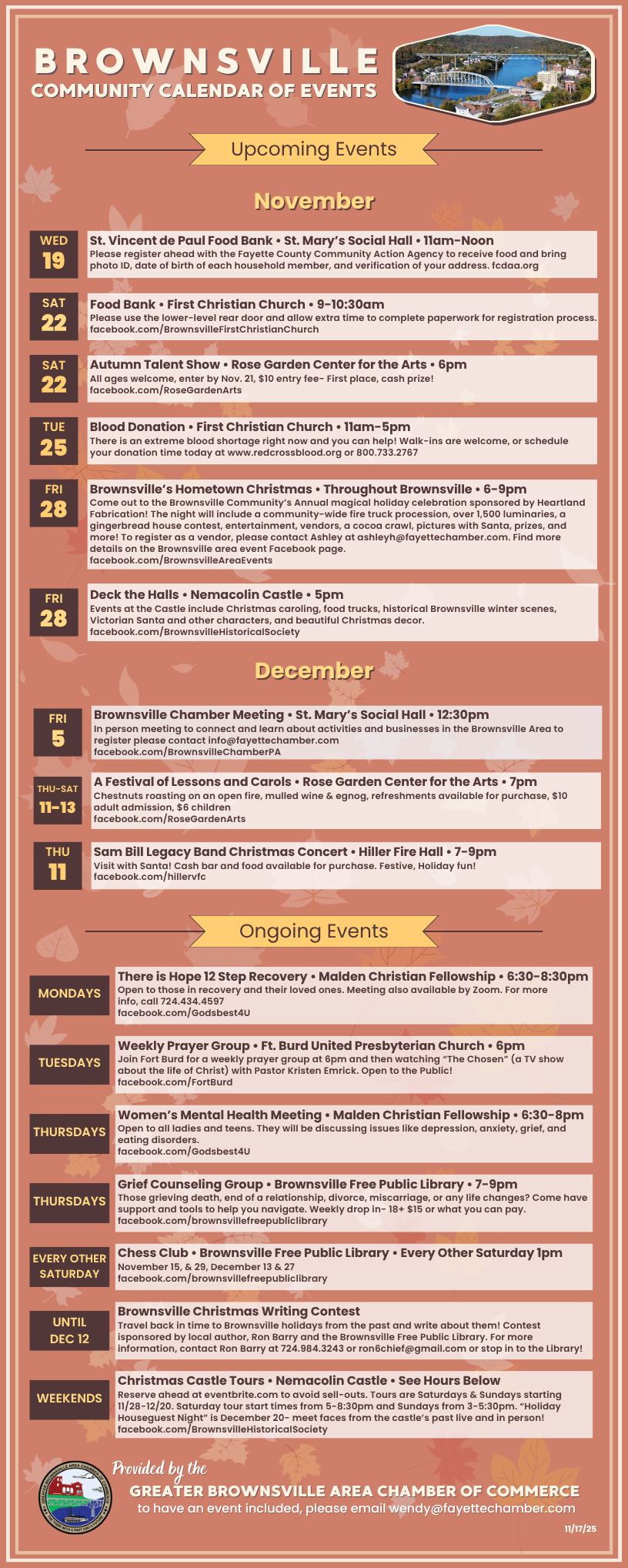 Find Out What’s Going On In and Around Brownsville, PA Photo by Jeffrey W. Hughes Photography Community Calendar Calendar is updated every Monday Helpful Websites Click to learn more: updated 11/17/25