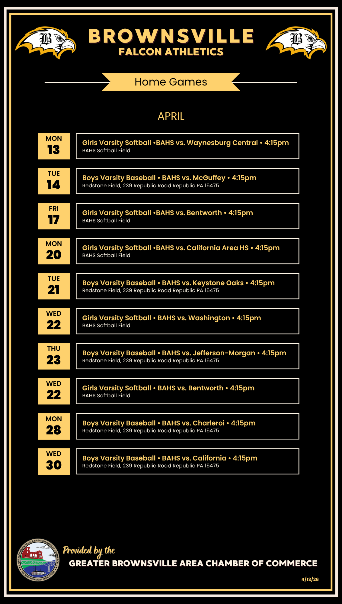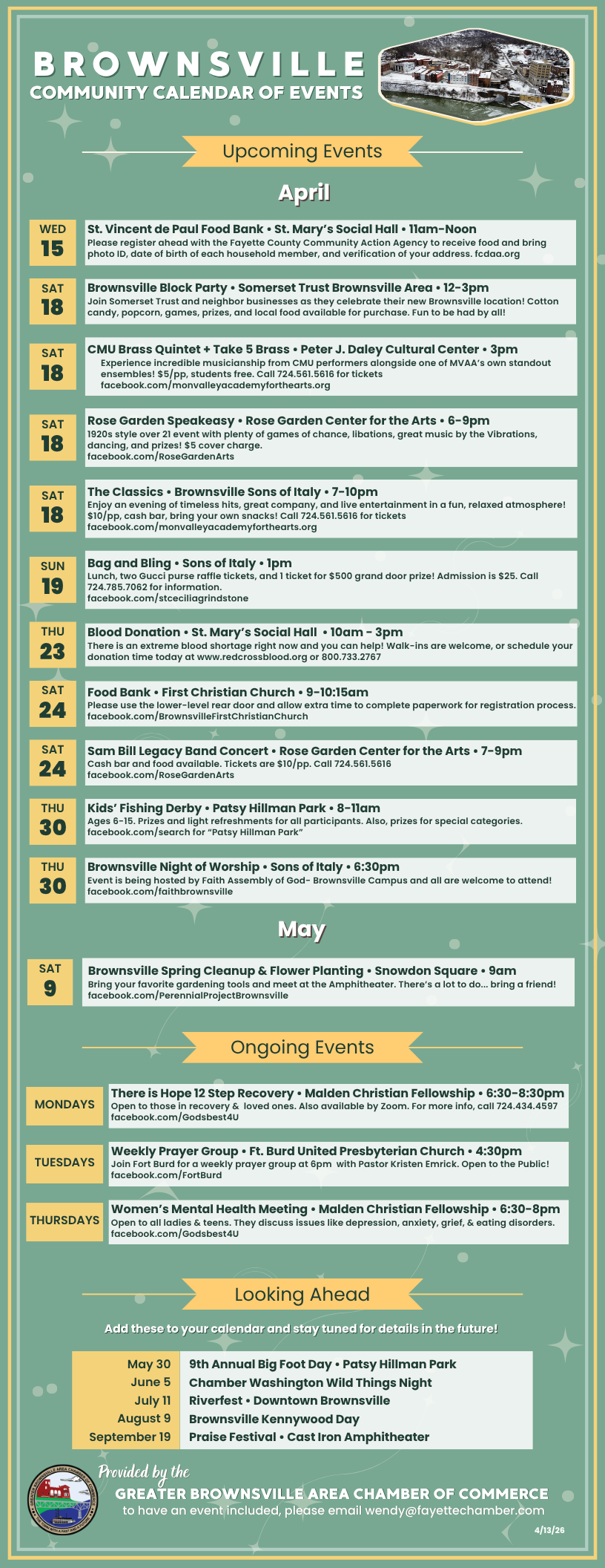 Find Out What’s Going On, In, and Around Brownsville, PA Photo by Jeffrey W. Hughes Photography Community Calendar Calendar is updated every Monday Helpful Websites Click to learn more: Updated 4/13/26